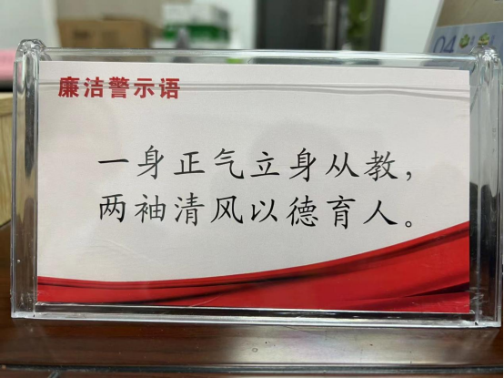 学院党委根据学院廉政风险特点,精选提炼出32条廉洁警示语,全院教职工通过在线选取适合个人风格的警示语,查阅他人选取的警示语等方式对廉洁文化进行学习交流。学院党委将廉洁警示语与姓名牌结合制成个人警示牌,展示摆放在办公桌面显著位置,起到自我警醒、自我监督的作用,促进学院形成“无私奉献、廉洁从教、廉洁育人”的良好教育氛围。老师们表示,通过亮牌活动进一步增强了以身作则、依法执教的意识。