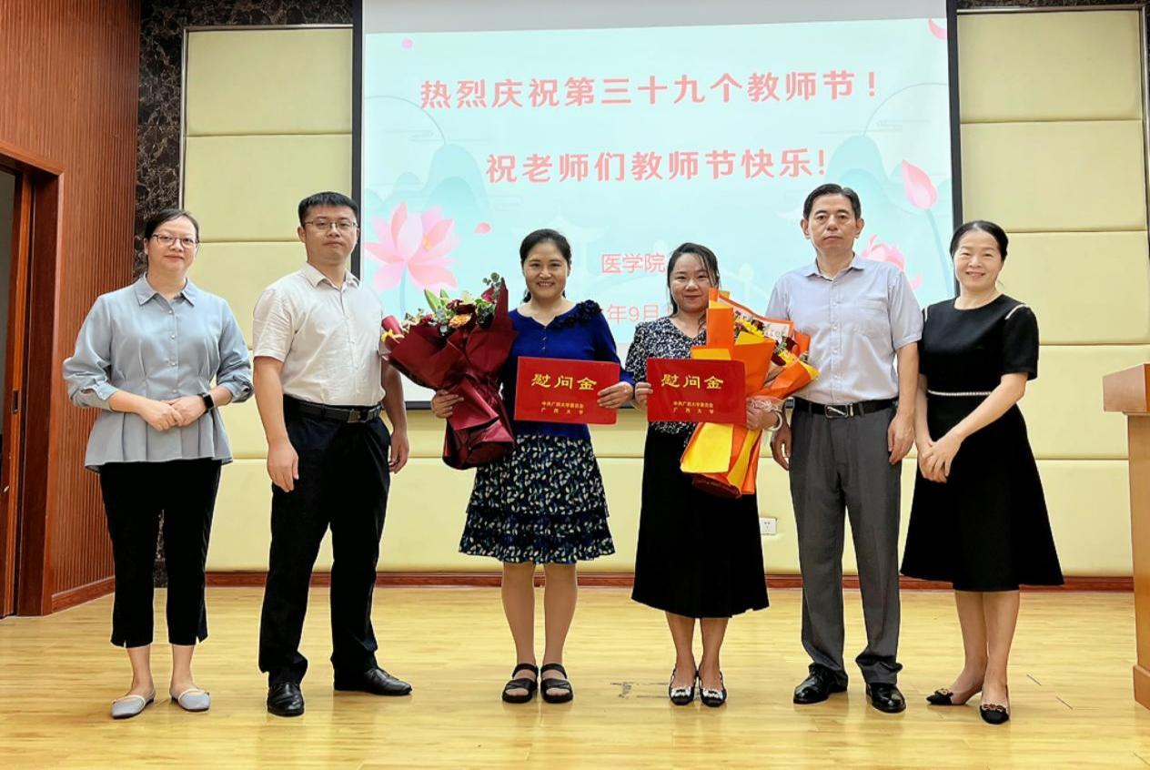 为庆祝第三十九个教师节,传达学校的关怀和温暖,9月8日上午,医学院党委书记李波带领学院领导班子成员看望慰问教师代表,向他们和全院教职工致以节日的祝福和诚挚的问候。党委书记李波、常务副院长王立升向君武学者罗素兰教授、陆翠霞两位教师代表送上鲜花和慰问金,与她们亲切交谈,对她们长期以来为学院人才培养和建设发展作出的贡献表示感谢。教师代表们对学院领导的关心爱护表示感谢,大家表示今后将继续努力,不忘初心,潜心钻研,以实际行动和工作成效为学院建设作出新的贡献。