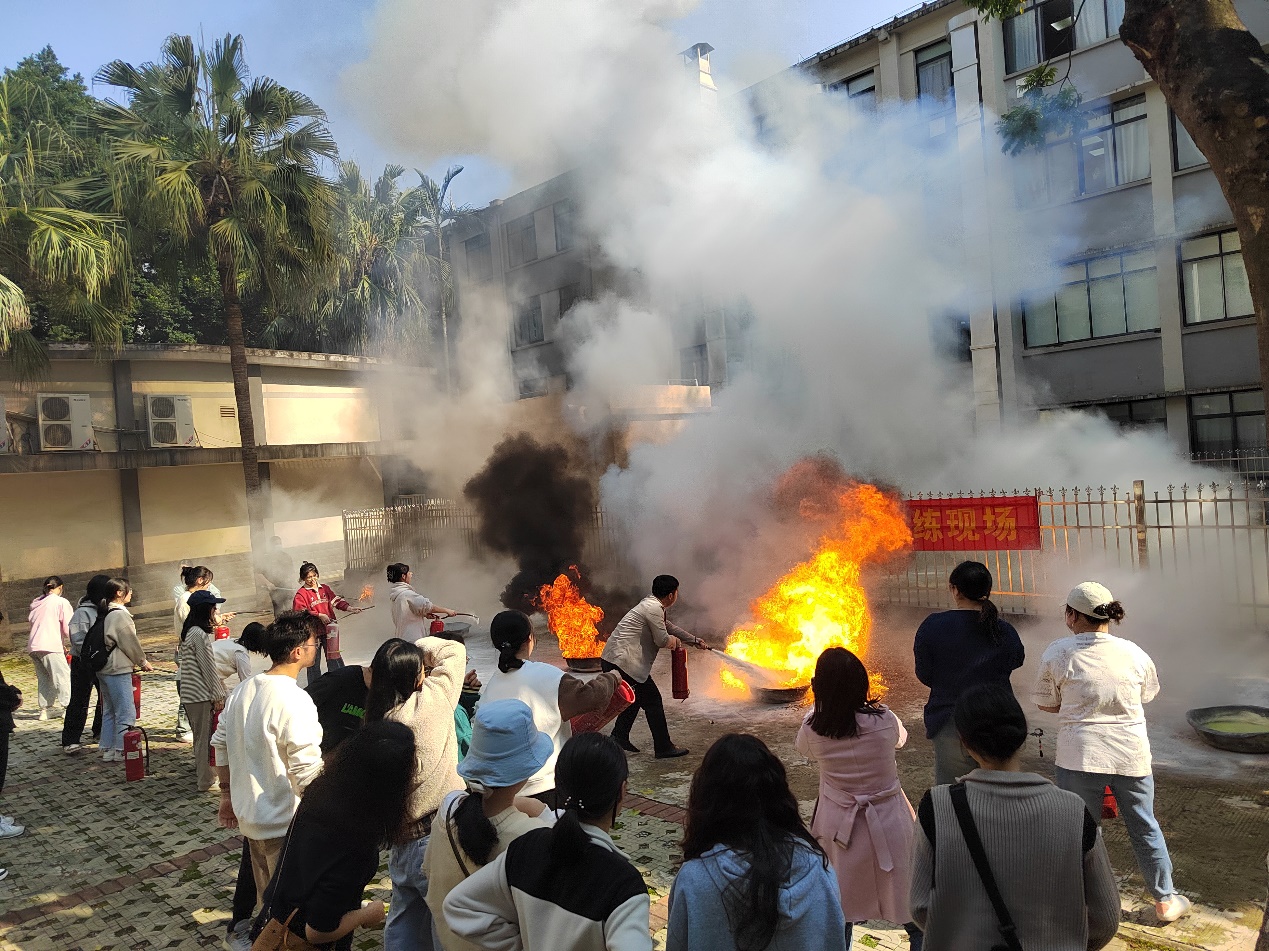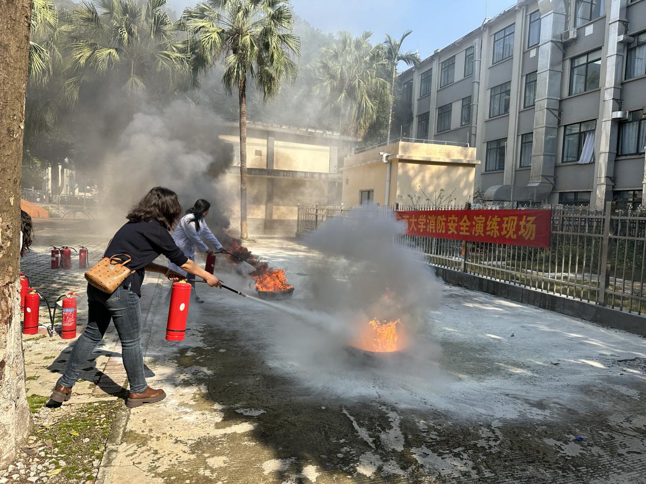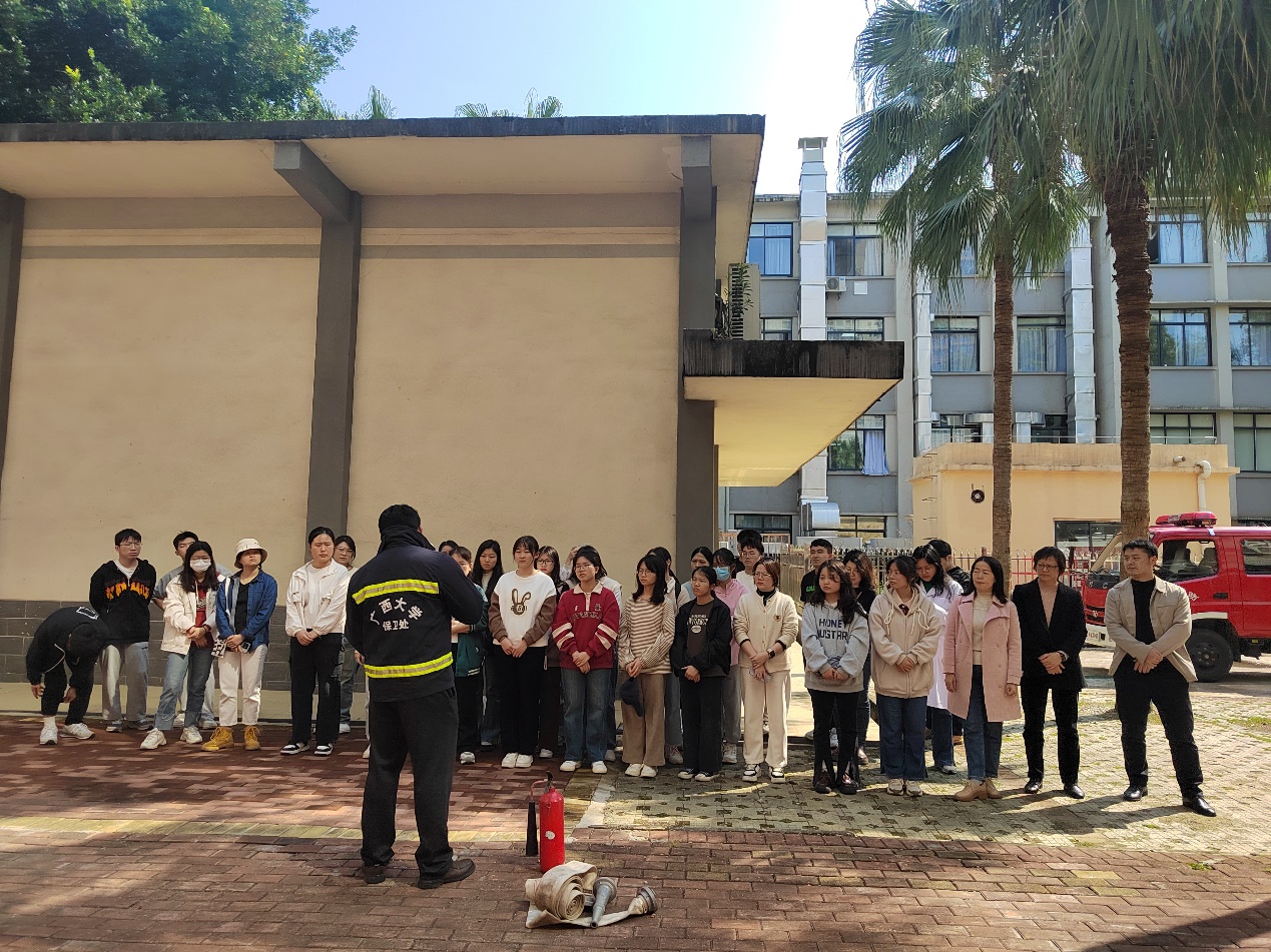 保卫处黄光电老师结合区内2023年以来发生的火灾案例,就公共场所与实验室的消防安全特点、消防隐患排查及逃生自救等事项进行深入的讲解,强调师生应当掌握消防安全“四个能力”。讲解之后,黄老师还指导师生在学院实验楼旁的空地进行灭火消防演练。通过实操,师生们掌握了灭火器灭火要领。紧接着,还在综合实验楼开展了消防疏散逃生演练。在浓浓烟雾中,师生们用手捂着口鼻、弯腰扶墙沿楼梯撤离,疏散及时有序,达到了演练效果。