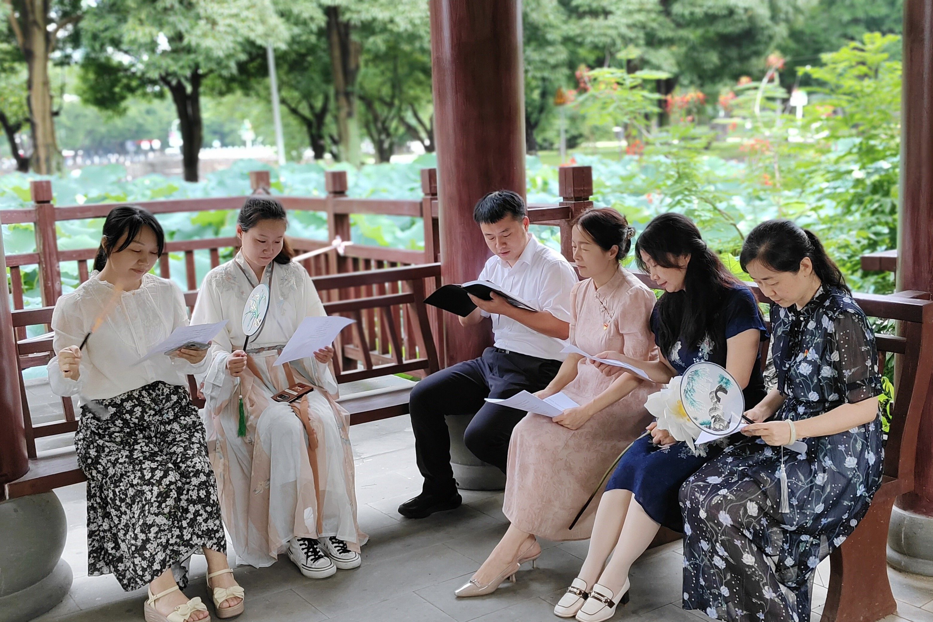 活动伊始,在荷花绽放的荷塘之畔,行政党支部书记廖碧莲首先向党员们介绍了荷花的文化寓意,荷花即青莲,又称莲花、芙蕖、水芙蓉、菡萏,以其“出淤泥而不染,濯清涟而不妖”的品格,自古便是高洁、清廉的象征。大家重温了北宋理学家周敦颐的《爱莲说》中的经典名句。李波同志分享了一首由西大学子为学校荷花有感而作的现代诗,将荷花美丽与廉洁的寓意巧妙地结合在一起,引起了在场党员们的共鸣。随后,党员们纷纷吟诵了各自精心准备的咏荷古诗,如“清水出芙蓉,天然去雕饰”“天赋本根如玉,濂溪以道心同”“莫笑出青泥,心净还如许”等,从诗词名句中品鉴荷花所蕴含的圣洁清雅品性。