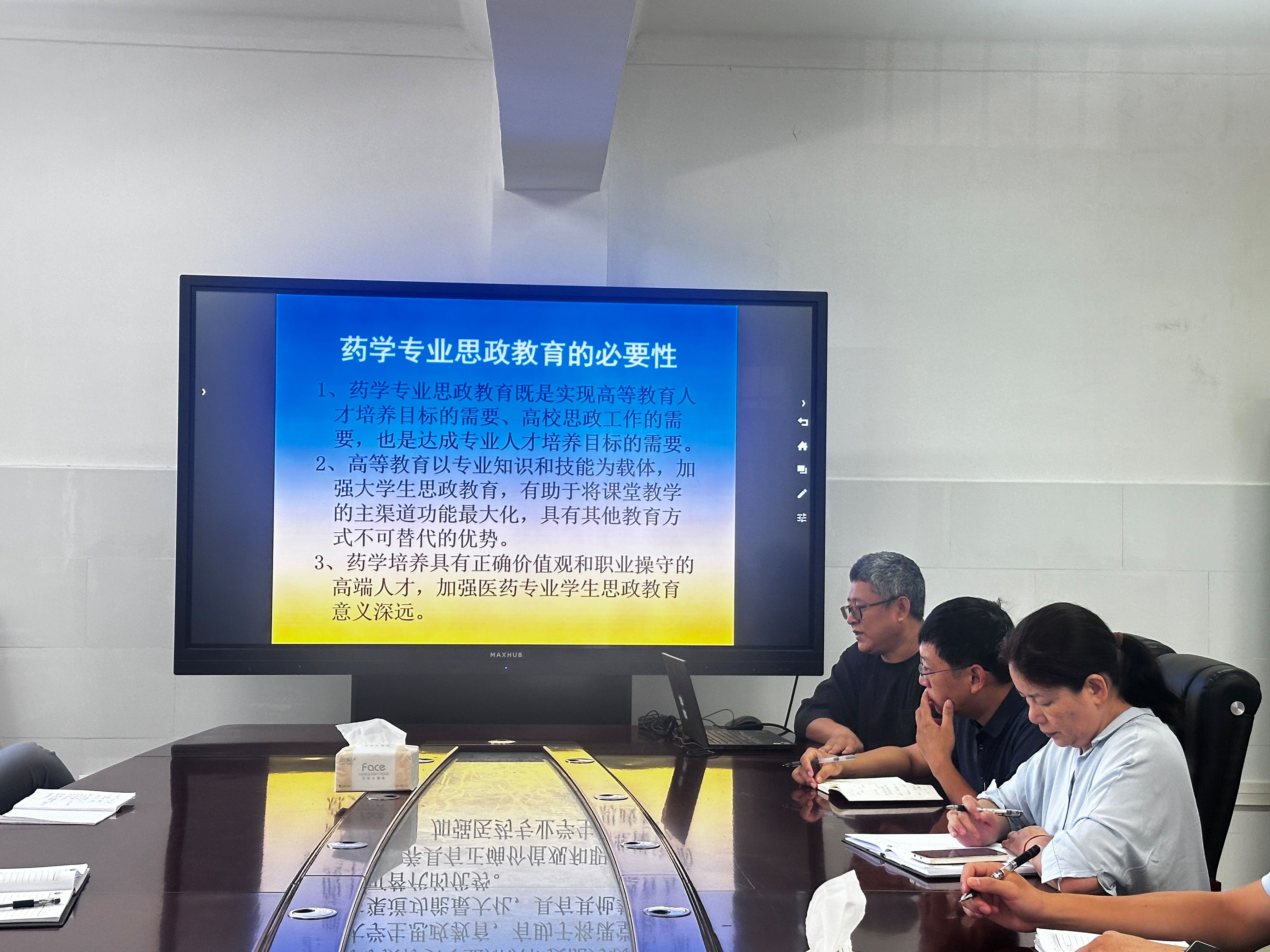 药学系主任杨华老师在会上作《“事-理-德-人”为主线的课程思政教学方法改革研究与经验交流》报告。重点围绕课程思政建设的必要性、思政课程思政资源库建设、考核评价体系和课程思政示范课建设等方面进行了经验分享和交流。还重点针对《药剂学》课程中思政元素的挖掘和融入进行了案例讲解。讨论会上,吴黎川副教授就课程思政项目申报和建设进行了经验分享,还针对课程思政中授课教师的育人情怀分享了自己的感悟和认识。刘坤鹏副教授结合《组织胚胎学》课程中思政元素的挖掘和教学方式,给大家介绍了自己的经验。朱晓鹏老师以优秀课程思政示范课《土木工程材料》为案例带领教师们进行了集体学习,围绕学习情况,大家就课程思政元素挖掘、案例库建设、教学技巧展开了热烈的讨论。