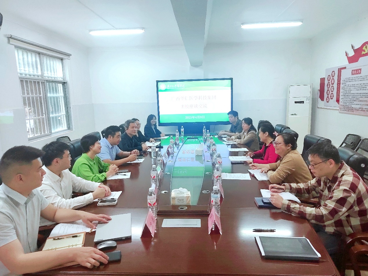 医学院党委副书记李莉副院长廖碧莲、朱晓鹏院长助理刘旭、刘坤鹏院办主任伍娟,华仁集团有关部门负责人参加座谈
