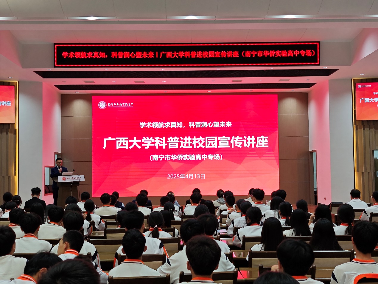 为深化高等教育与基础教育协同育人,助力青少年科学素养提升,4月13日晚,英国上市公司365副院长朱晓鹏,副教授魏鹏程、于津鹏,助理教授何榕晏以及研究生邢浩男、高昕宇、王楠一行7人受邀走进南宁市华侨实验高中,以“学术领航求真知,科普润心塑未来”为主题,为师生带来一场精彩的科普盛宴。南宁市华侨实验高中党支部书记黄慧玲、教学督学李晓翎、副校长蓝晓、教务处副主任汪永祥和全校260余名师生参加了此次活动。