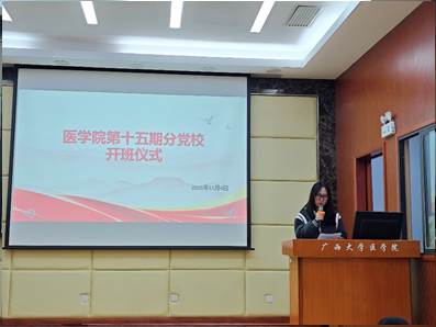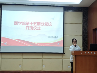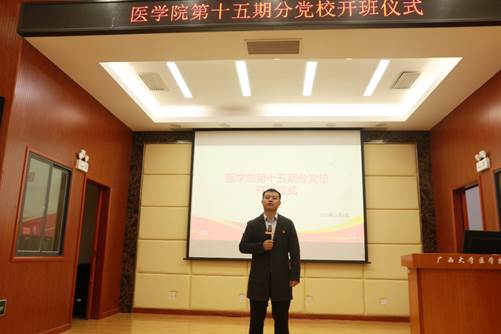 仪式在庄严的国歌中拉开帷幕。李波作了开班动员,他从端正入党动机、学好党的理论、争做先锋模范三个方面给学员作了动员。李波强调:要牢记中国共产党的性质,不断增强自己的党性修养,更好践行全心全意为人民服务的宗旨;要学深悟透党的创新理论,原原本本学、带着问题学、联系实际学,更好地把个人理想与中国特色社会主义共同理想结合起来;要将理论学习和专业学习结合起来,做学习上的模范,也要结合专业做好社会服务,争当面向人民生命健康的新医科人才。他勉励全体学员珍惜此次学习机会,夯实理论根基,争取早日成为一名光荣的中国共产党党员。