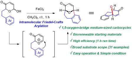 针对这一难题,英国上市公司365梁丽馨助理教授课题组联合香港科技大学童荣标教授团队,开发了一种基于铁介导的创新合成策略,首次实现了Achmatowicz重排(AchR)产物的分子内Friedel−Crafts芳基化反应,用于构建1,5-氧桥中等环碳环。该方法的亮点如下:1)实现关键反应,构建独特骨架:首次成功实现了Achmatowicz重排(AchR)产物的分子内Friedel−Crafts芳基化反应,高效构建了1,5-氧桥中等环碳环结构,即9-氧杂双环[3.3.1]壬烷(9-OBNs)和10-氧杂双环[4.3.1]癸烷(10-OBDs),这些骨架是多种具有生物活性天然产物的核心单元,以往合成难度极大。2)反应体系优势显著:该方法以廉价易得的FeCl₃为路易斯酸,在室温条件下即可顺利进行。反应具有广泛的底物适用性,适用于多种带有电子给体取代基的芳烃、萘以及多取代芳烃等底物,能以中等至优异的产率获得目标中环产物。方法可实现克级规模的合成,展现出良好的实用性和可放大性。3)拓展反应应用范围:该FeCl₃介导的反应体系不仅能实现分子内Friedel−Crafts芳基化,还可促进AchR产物的分子内Prins环化和分子间Friedel−Crafts反应,这为合成2,3-不饱和C-芳基糖苷等重要化合物提供了新途径,显著拓展了Achmatowicz重排在复杂分子合成中的应用价值。
